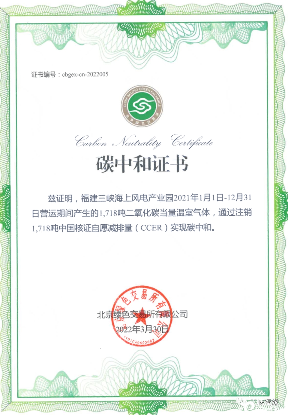 近日,北京綠色交易所向福建三峽海上風電產業園頒發“碳中和證書”,標志著福建三峽海上風電產業園連續兩年實現“碳中和”,為我國各工業園區實現“綠色低碳”發展起到積極的引領示范作用。