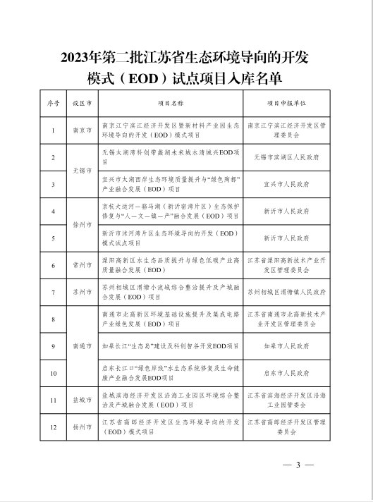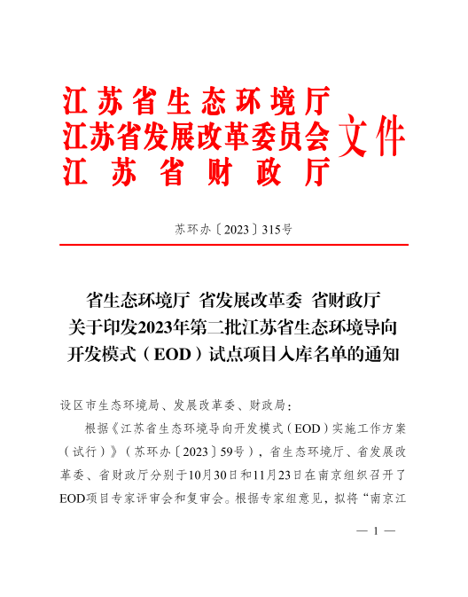 近日,江蘇省生態環境廳、江蘇省發展改革委員會、江蘇省財政廳聯合印發2023年第二批江蘇省生態環境導向開發模式(EOD)試點項目入庫名單,共計16個項目納入省級EOD項目庫。加上首批14個項目,目前江蘇省級EOD項目庫已有30個項目。