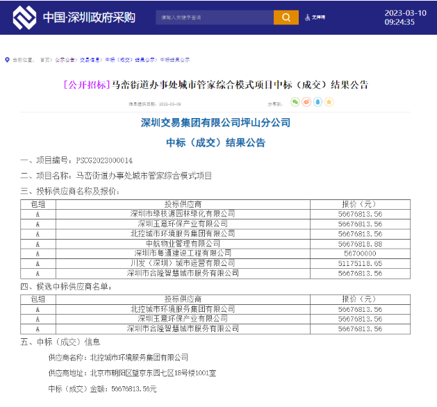 北控城市資源集團有限公司(下稱「公司」或「集團」;股份代號:03718.HK)欣然宣布,本公司全資子公司北控城市環境服務集團有限公司于2023年3月9日成功中標廣東省深圳市坪山區馬巒街道辦事處城市管家綜合模式項目。