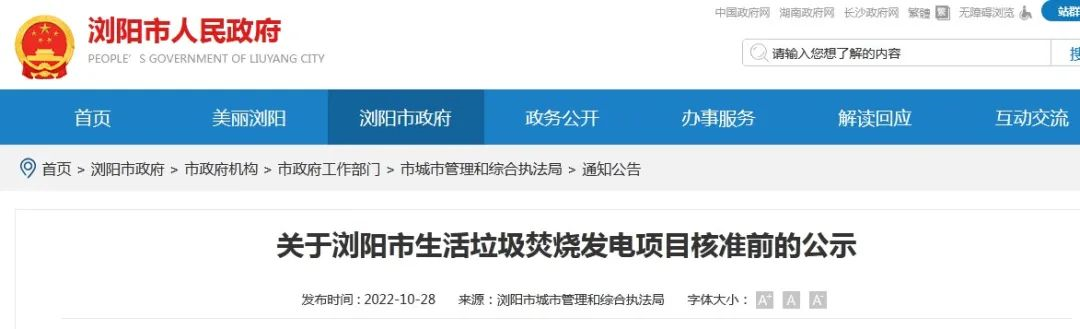 日前,瀏陽市城市管理和綜合執法局發布關于瀏陽市生活垃圾焚燒發電項目核準前的公示。。詳情如下: