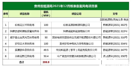 根(gen)據《省(sheng)人(ren)民政府(fu)關于印(yin)發(fa)(fa)貴州省(sheng)企業投資項(xiang)目(mu)核準和備案管理辦法的通知》(黔府(fu)發(fa)(fa)〔2018〕第7號),按照程(cheng)序,貴州省(sheng)能源(yuan)局2021年12月核準備案風電項(xiang)目(mu)6個,裝機規模共399.9MW。
