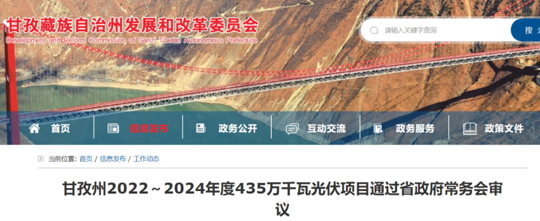 5月17日(ri),四川(chuan)省(sheng)甘孜州(zhou)2022~2024年度(du)435萬(wan)千瓦光伏項(xiang)目經省(sheng)政府第(di)103次常務會議(yi)審議(yi)通過,為四川(chuan)省(sheng)目前唯一批復同意的集中式(shi)、大(da)規模光伏開發項(xiang)目,為下一步全州(zhou)打造國家重(zhong)要清潔能源(yuan)基地工作再上(shang)新臺階奠定了堅實基礎。