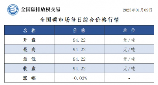 2025年1月(yue)9日(ri)全(quan)國碳市場綜合(he)價格行情為(wei): 開盤價94.22元/噸(dun),最高價94.22元/噸(dun),最低價94.22元/噸(dun),收盤價94.22元/噸(dun),收盤價較前一日(ri)下跌(die)0.03%。