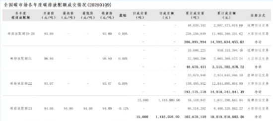 截至2025年1月9日,全國碳市場(chang)碳排放配額累計(ji)成(cheng)交量630,420,342噸(dun),累計(ji)成(cheng)交額43,046,989,449.99元。