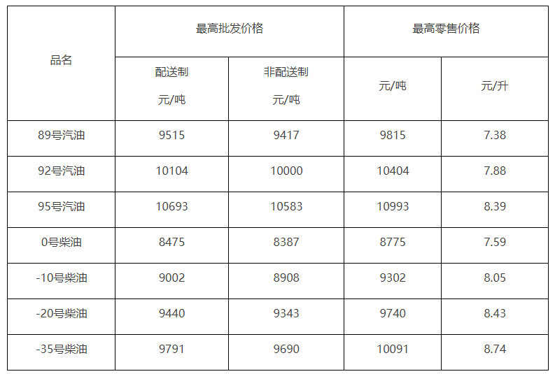 根據國家發展改革(ge)委國內(nei)成(cheng)品(pin)油(you)價(jia)(jia)格(ge)調(diao)(diao)整(zheng)要(yao)求(qiu),按(an)照(zhao)成(cheng)品(pin)油(you)價(jia)(jia)格(ge)形成(cheng)機制(zhi),北京市(shi)汽(qi)、柴(chai)(chai)油(you)最(zui)高零(ling)售(shou)價(jia)(jia)格(ge)自2023年4月17日24時起,每(mei)(mei)(mei)(mei)噸(dun)(dun)分別提高550元(yuan)(yuan)(yuan)(yuan)(yuan)和525元(yuan)(yuan)(yuan)(yuan)(yuan);89號汽(qi)油(you)由(you)每(mei)(mei)(mei)(mei)升(sheng)6.96元(yuan)(yuan)(yuan)(yuan)(yuan)調(diao)(diao)整(zheng)為7.38元(yuan)(yuan)(yuan)(yuan)(yuan),提高0.42元(yuan)(yuan)(yuan)(yuan)(yuan);92號汽(qi)油(you)由(you)每(mei)(mei)(mei)(mei)升(sheng)7.44元(yuan)(yuan)(yuan)(yuan)(yuan)調(diao)(diao)整(zheng)為7.88元(yuan)(yuan)(yuan)(yuan)(yuan),提高0.44元(yuan)(yuan)(yuan)(yuan)(yuan);95號汽(qi)油(you)由(you)每(mei)(mei)(mei)(mei)升(sheng)7.92元(yuan)(yuan)(yuan)(yuan)(yuan)調(diao)(diao)整(zheng)為8.39元(yuan)(yuan)(yuan)(yuan)(yuan),提高0.47元(yuan)(yuan)(yuan)(yuan)(yuan);0號柴(chai)(chai)油(you)由(you)每(mei)(mei)(mei)(mei)升(sheng)7.14元(yuan)(yuan)(yuan)(yuan)(yuan)調(diao)(diao)整(zheng)為7.59元(yuan)(yuan)(yuan)(yuan)(yuan),提高0.45元(yuan)(yuan)(yuan)(yuan)(yuan)(具體(ti)價(jia)(jia)格(ge)見附(fu)件)。各成(cheng)品(pin)油(you)零(ling)售(shou)企(qi)業(ye)可(ke)在不(bu)超過(guo)最(zui)高零(ling)售(shou)價(jia)(jia)格(ge)的前提下,自主制(zhi)定(ding)(ding)(ding)具體(ti)零(ling)售(shou)價(jia)(jia)格(ge)。北京市(shi)汽(qi)、柴(chai)(chai)油(you)最(zui)高批(pi)發價(jia)(jia)格(ge),合同約(yue)定(ding)(ding)(ding)由(you)供方配送到零(ling)售(shou)企(qi)業(ye)的,按(an)照(zhao)最(zui)高零(ling)售(shou)價(jia)(jia)每(mei)(mei)(mei)(mei)噸(dun)(dun)扣(kou)減300元(yuan)(yuan)(yuan)(yuan)(yuan)確定(ding)(ding)(ding);合同未(wei)約(yue)定(ding)(ding)(ding)配送的,按(an)照(zhao)最(zui)高零(ling)售(shou)價(jia)(jia)每(mei)(mei)(mei)(mei)噸(dun)(dun)扣(kou)減300元(yuan)(yuan)(yuan)(yuan)(yuan)和運雜費(最(zui)高零(ling)售(shou)價(jia)(jia)格(ge)的1%)確定(ding)(ding)(ding)。