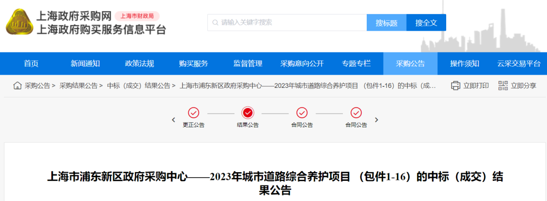 近日,中國固廢網從E20環境平臺(tai)標(biao)訊采(cai)集系統E標(biao)通獲悉,上海市2023年(nian)(nian)(nian)城市道路綜(zong)合養護(hu)項目(mu) (包件(jian)1-16)發布中標(biao)公告,16個標(biao)段(包件(jian)1-16)成交總(zong)(zong)額(e)(e)14.98億元/年(nian)(nian)(nian),服務(wu)期3年(nian)(nian)(nian),三年(nian)(nian)(nian)服務(wu)費總(zong)(zong)額(e)(e)約為45億元。