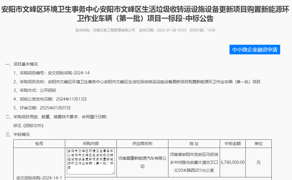1月8日,安(an)陽市(shi)文峰區環(huan)境衛(wei)生事務中(zhong)(zhong)(zhong)心(xin)發布安(an)陽市(shi)文峰區環(huan)境衛(wei)生事務中(zhong)(zhong)(zhong)心(xin)安(an)陽市(shi)文峰區生活(huo)垃圾(ji)收轉運設施設備更新(xin)項目(mu)購置新(xin)能源(yuan)(yuan)環(huan)衛(wei)作業車輛(第一(yi)批)項目(mu)中(zhong)(zhong)(zhong)標(成交)結果公(gong)(gong)(gong)(gong)告,項目(mu)總金(jin)額3005萬元,共分(fen)為6各標段(duan)(duan),分(fen)別被河(he)南(nan)犀重新(xin)能源(yuan)(yuan)汽(qi)車有(you)限(xian)公(gong)(gong)(gong)(gong)司、福龍馬集團股份(fen)有(you)限(xian)公(gong)(gong)(gong)(gong)司、武漢(han)市(shi)漢(han)福專用車有(you)限(xian)公(gong)(gong)(gong)(gong)司、河(he)南(nan)贊博環(huan)保科技有(you)限(xian)公(gong)(gong)(gong)(gong)司共4家(jia)民企包攬(lan),其中(zhong)(zhong)(zhong),河(he)南(nan)犀重新(xin)能源(yuan)(yuan)汽(qi)車有(you)限(xian)公(gong)(gong)(gong)(gong)司攬(lan)獲三(san)包,中(zhong)(zhong)(zhong)標該項目(mu)的第一(yi)、二(er)、三(san)標段(duan)(duan)。