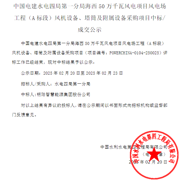 根據公示,中標人為明陽智慧能(neng)源集(ji)團股份(fen)公司。