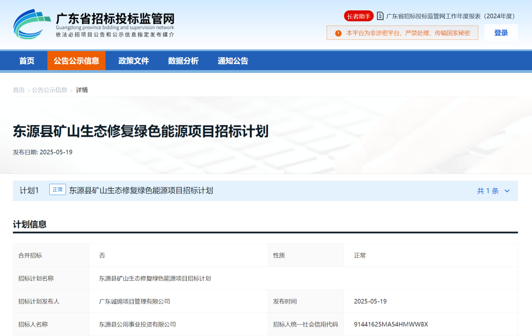 近日,中國固廢網從(cong)E20環境平臺標(biao)訊采集(ji)系(xi)統(tong)E標(biao)通獲悉(xi),廣(guang)東省河(he)源(yuan)(yuan)市(shi)東源(yuan)(yuan)縣礦山生態修復綠色能源(yuan)(yuan)項(xiang)目(mu)招標(biao)計(ji)劃(hua)于近日發(fa)布(bu),項(xiang)目(mu)總投資為144409. 03萬元。