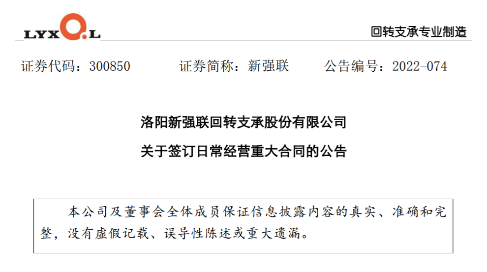 9月27日,洛陽新強聯回轉(zhuan)支(zhi)承股份有限公(gong)(gong)司(以下(xia)簡(jian)稱“新強聯”或“公(gong)(gong)司)發布《關于(yu)簽(qian)訂日常經營重大合同的公(gong)(gong)告(gao)》。
