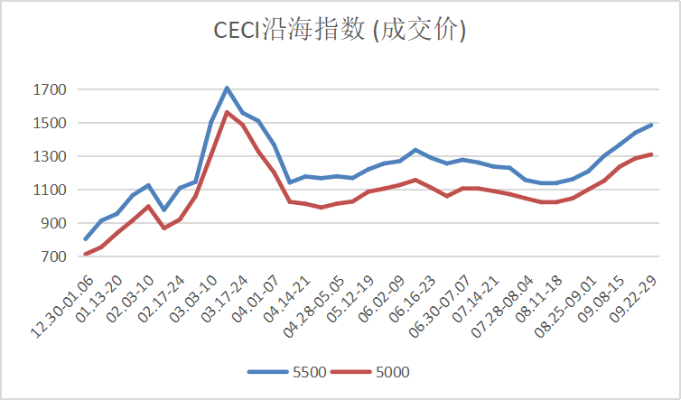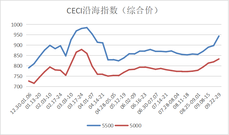 9月22日(ri)至29日(ri),國內電(dian)煤(mei)價格(ge)情(qing)況(kuang) :5500大卡電(dian)煤(mei)綜(zong)合(he)價944元/噸,環比增長46%,相比上(shang)期漲(zhang)(zhang)幅5.1%,成(cheng)交價為1309元/噸,環比增長45%,漲(zhang)(zhang)幅3.1%。