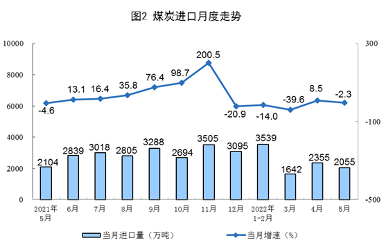 原(yuan)煤(mei)生產(chan)保(bao)持較快增(zeng)(zeng)長(chang),進口(kou)由增(zeng)(zeng)轉降。隨著(zhu)煤(mei)炭保(bao)供穩價政策深入(ru)推進,原(yuan)煤(mei)生產(chan)繼續(xu)保(bao)持較快增(zeng)(zeng)長(chang)。5月份,生產(chan)原(yuan)煤(mei)3.7億噸(dun),同(tong)比(bi)增(zeng)(zeng)長(chang)10.3%,增(zeng)(zeng)速比(bi)上(shang)月放緩0.4個百(bai)分點(dian),日(ri)均產(chan)量(liang)1187萬(wan)噸(dun)。進口(kou)煤(mei)炭2055萬(wan)噸(dun),同(tong)比(bi)下降2.3%,上(shang)月為增(zeng)(zeng)長(chang)8.5%。