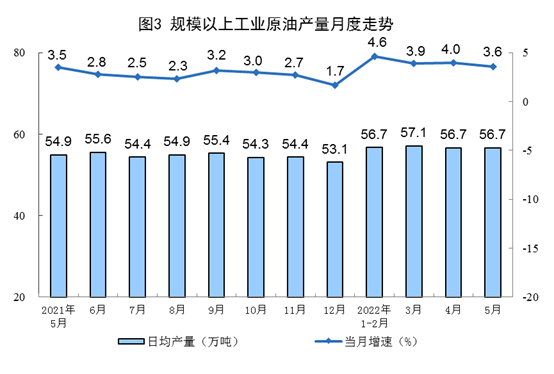 原(yuan)油(you)生(sheng)(sheng)產(chan)平(ping)穩,進口(kou)有所加快。5月(yue)份,生(sheng)(sheng)產(chan)原(yuan)油(you)1757萬(wan)(wan)噸(dun)(dun),同比增(zeng)長3.6%,增(zeng)速(su)比上月(yue)放緩0.4個(ge)百分(fen)點(dian),日(ri)均(jun)產(chan)量56.7萬(wan)(wan)噸(dun)(dun)。進口(kou)原(yuan)油(you)4582萬(wan)(wan)噸(dun)(dun),同比增(zeng)長11.8%,比上月(yue)加快5.2個(ge)百分(fen)點(dian)。