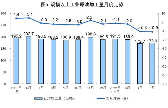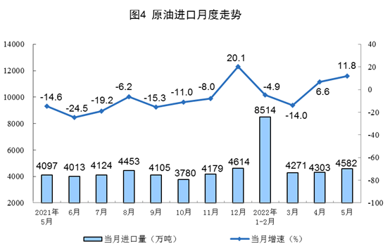 1—5月份(fen),生(sheng)產原油8569萬噸,同比增長4.1%。進口原油21671萬噸,同比下降1.7%。