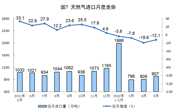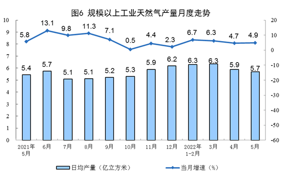 天然氣生(sheng)產保持穩定,進口(kou)降(jiang)幅(fu)收(shou)窄(zhai)。5月(yue)份,生(sheng)產天然氣177億立方米,同比(bi)增長4.9%,增速比(bi)上(shang)月(yue)加快0.2個(ge)百(bai)(bai)分點,日均產量5.7億立方米。進口(kou)天然氣907萬噸,同比(bi)下降(jiang)12.1%,降(jiang)幅(fu)比(bi)上(shang)月(yue)收(shou)窄(zhai)7.5個(ge)百(bai)(bai)分點。