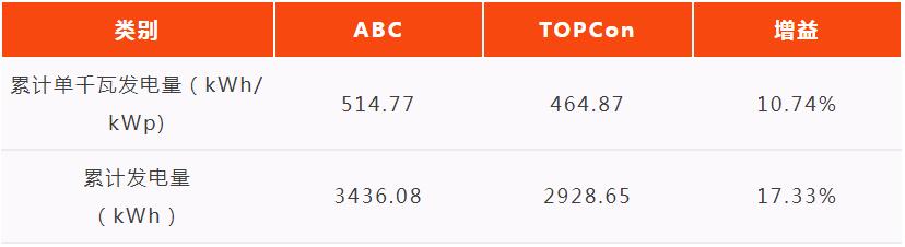 數據(ju)顯示,在2024年(nian)2月29日到(dao)(dao)2024年(nian)9月9日的(de)193天監測(ce)周(zhou)期內,愛旭(xu)N型(xing)(xing)ABC組(zu)件的(de)累計單(dan)千瓦(wa)發(fa)電(dian)量達到(dao)(dao)了514.77 KWh/kWp,較TOPCon組(zu)件的(de)464.87 kWh/kWp單(dan)千瓦(wa)發(fa)電(dian)量增益10.74%。同時,得益于愛旭(xu)N型(xing)(xing)ABC組(zu)件同等面(mian)積下6%的(de)功率領先,其累計發(fa)電(dian)量高(gao)達3436 KWh,而同等安(an)裝面(mian)積下的(de)TOPCon組(zu)件累計發(fa)電(dian)量為2928 kWh,愛旭(xu)N型(xing)(xing)ABC較TOPCon累計單(dan)位面(mian)積發(fa)電(dian)增益為17.33%。
